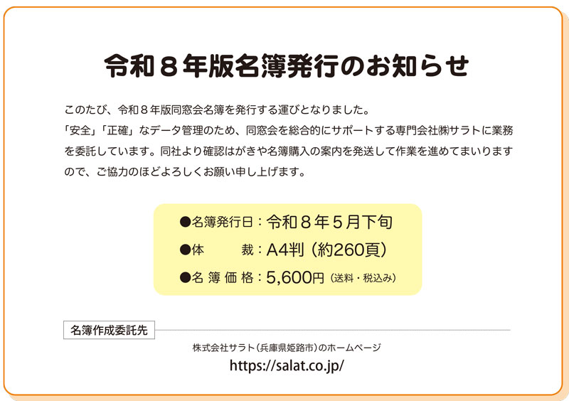 今回の役員変更で第4代谷川元康会長(1回生)が退任、淺井宏昌会長(4回生)が新たに第5代会長に就任しました。それに伴い、役員も変更されています。詳細は「会長挨拶・役員紹介」ページをご覧ください。